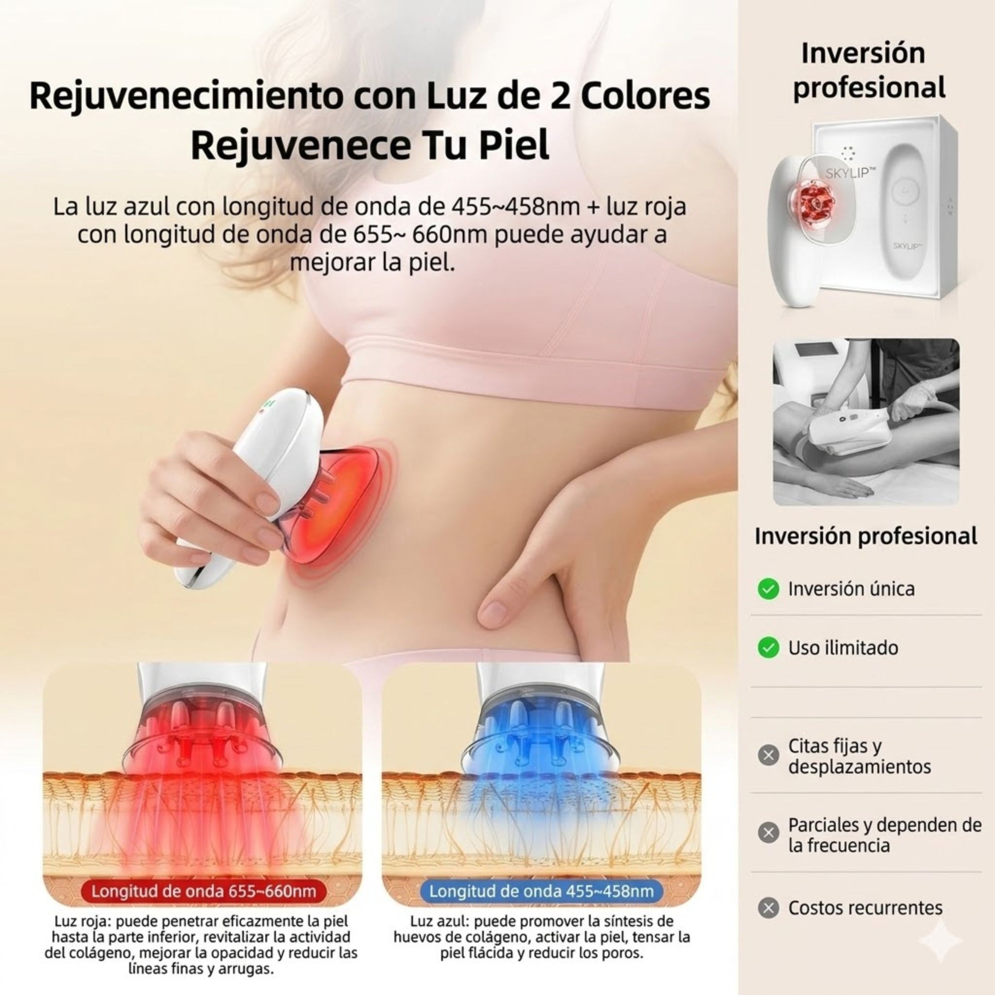 El dispositivo SKYLIP™ combina microcorriente EMS y presión negativa para estimular músculos, mejorar la circulación y favorecer una piel más firme. Disfruta sesiones de lipomodelación desde casa y ayuda a reducir la apariencia de flacidez y celulitis de forma cómoda, práctica y efectiva.
